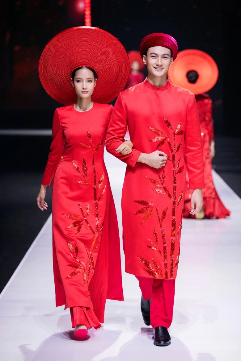 Vẫn là chiếc áo dài truyền thống nức tiếng giới mộ điệu, nữ nhà thiết kế đã khéo léo lồng ghép những chi tiết như viền đăng ten, như một cách gợi nhớ về tà áo dài Lemur - sáng tạo của hoạ sĩ Cát Tường về việc cách tân áo dài vào thế kỷ trước. Những tà áo của nữ nhà mốt vừa truyền thống, lại rất tân thời và phù hợp với nhịp sống sôi động, phát triển từng ngày của làng mốt đương đại. Để hoàn thành một tổng thể ấn tượng, thu hút mọi ánh nhìn thì không thể không nhắc đến những chiếc mấn to bản, giúp người mặc như trở thành những nàng dâu lộng lẫy, nổi bật trong chính ngày trọng đại của đời mình.
