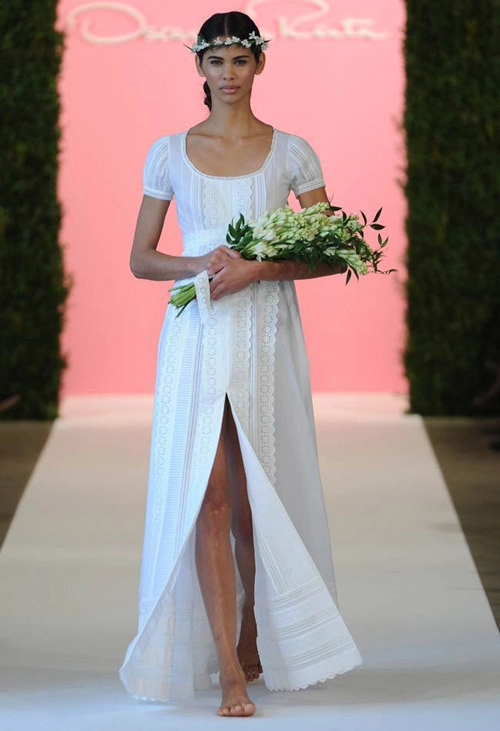 Phụ kiện đính đá to bản, hình ảnh cô dâu chân đất trên sàn catwalk cũng là những chi tiết đắt giá trong bộ sưu tập của Oscar de la Renta mùa này.