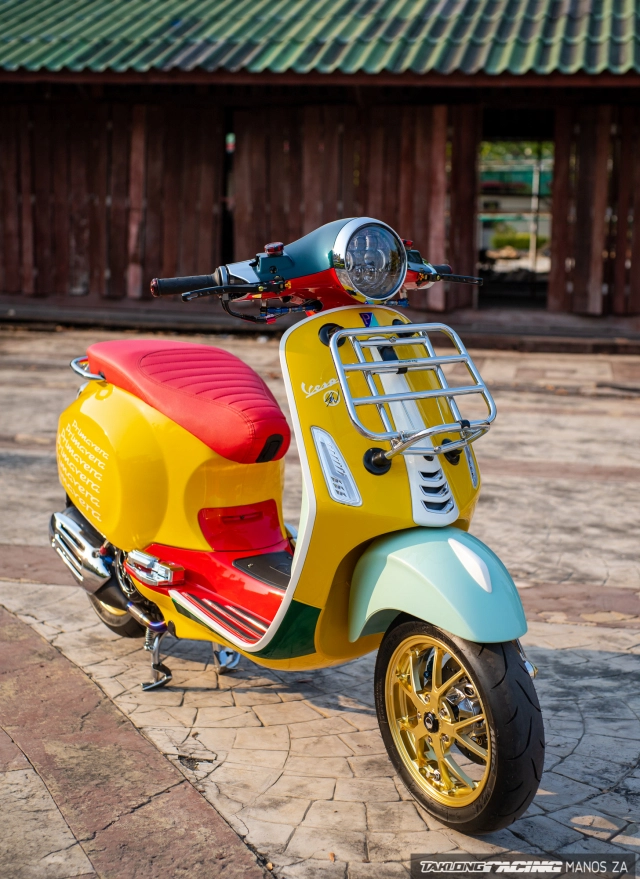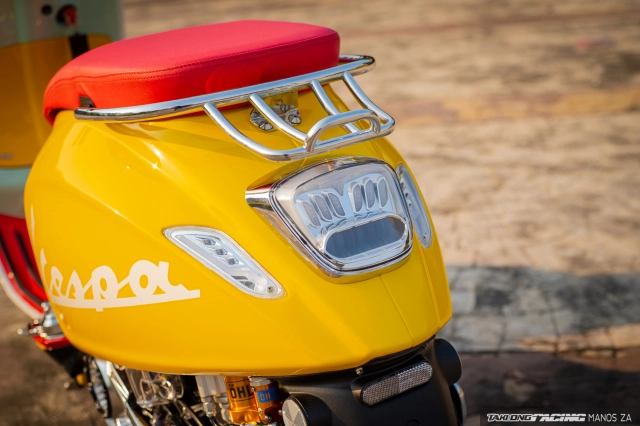 Chiến xe được hoàn thiện đến từng chi tiết nhỏ từ nắp xăng, gác chân và nắp nồi toàn bộ điều là những món đồ chơi mà giới độ Vespa cực yêu thích, không chỉ làm đẹp mà còn đem lại một số hiệu năng nhất định thêm cho xe.