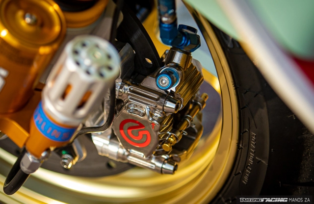 Cùm thắng bên phải sẽ là siêu phẩm Brembo Rossi một trong những dòng tay thắng được coi là đắt đỏ nhất hiện nay, chưa dừng lại ở việc mua cùm người dùng còn sắp thêm cả dàng linh kiện cho nó thêm nổi bật điển hình như núm tăng chỉnh thắng, ốc tay thắng và khúc gãy Kohken V2.